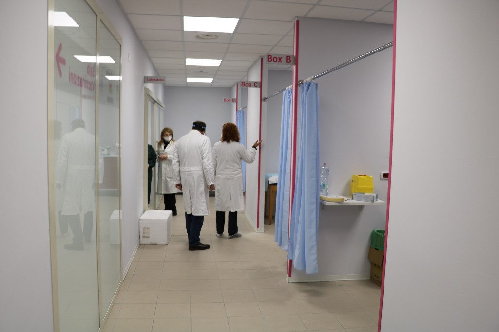 L’area di circa 50 mq comprende quattro box con poltrona e lettino, una stanza per l’osservazione post-somministrazione, la postazione informatica utile alla registrazione in piattaforma telematica, un ambiente adibito alla preparazione delle dosi in assenza di rischi di contaminazione con cappa, frigorigero e banco di lavoro. L’ingresso è accessibile anche con autoambulanza ed è attrezzato con desk accettazione. Apposita segnaletica garantisce il distanziamento e differenzia i percorsi. La presenza di medici anestesisti rianimatori nello stesso edificio (presso l’Utir al piano 2) offre la possibilità di assistenza specialistica nella rara eventualità di shock anafilattico post-somministrazione; l’attività vaccinale è costantemente presidiata da personale medico e infermieristico.