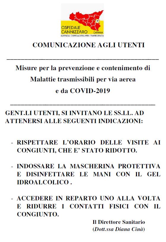 Nell'ambito delle misure per la prevenzione e contenimento di malattie trasmissibili per via aerea e da Covid-19, nell'accesso ai locali dell'Azienda Ospedaliera Cannizzaro, gli utenti sono pregati di osservare le seguenti disposizioni: