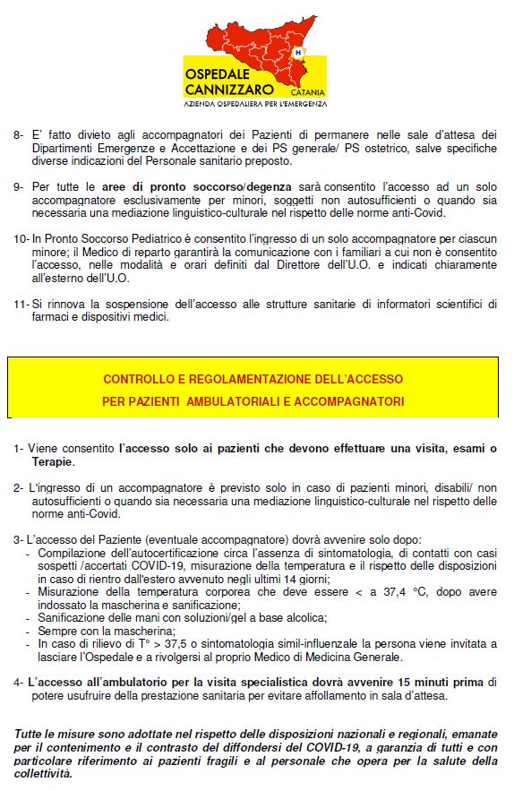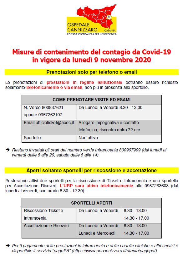 L’Azienda Ospedaliera Cannizzaro, al fine di ridurre le occasioni di contagio da Covid-19, ha rimodulato alcuni servizi di front-office e adottato misure di contenimento regolamentando gli accessi.